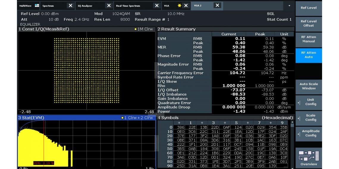 R&S®FSW-K144和R&S®FSW-K145选项包括在下行链路和上行链路中3GPP 5G NR的带内测量。对每个信号子帧进行了分析,给出了各种测量结果,包括不同信道和信号的EVM、频率和功率。